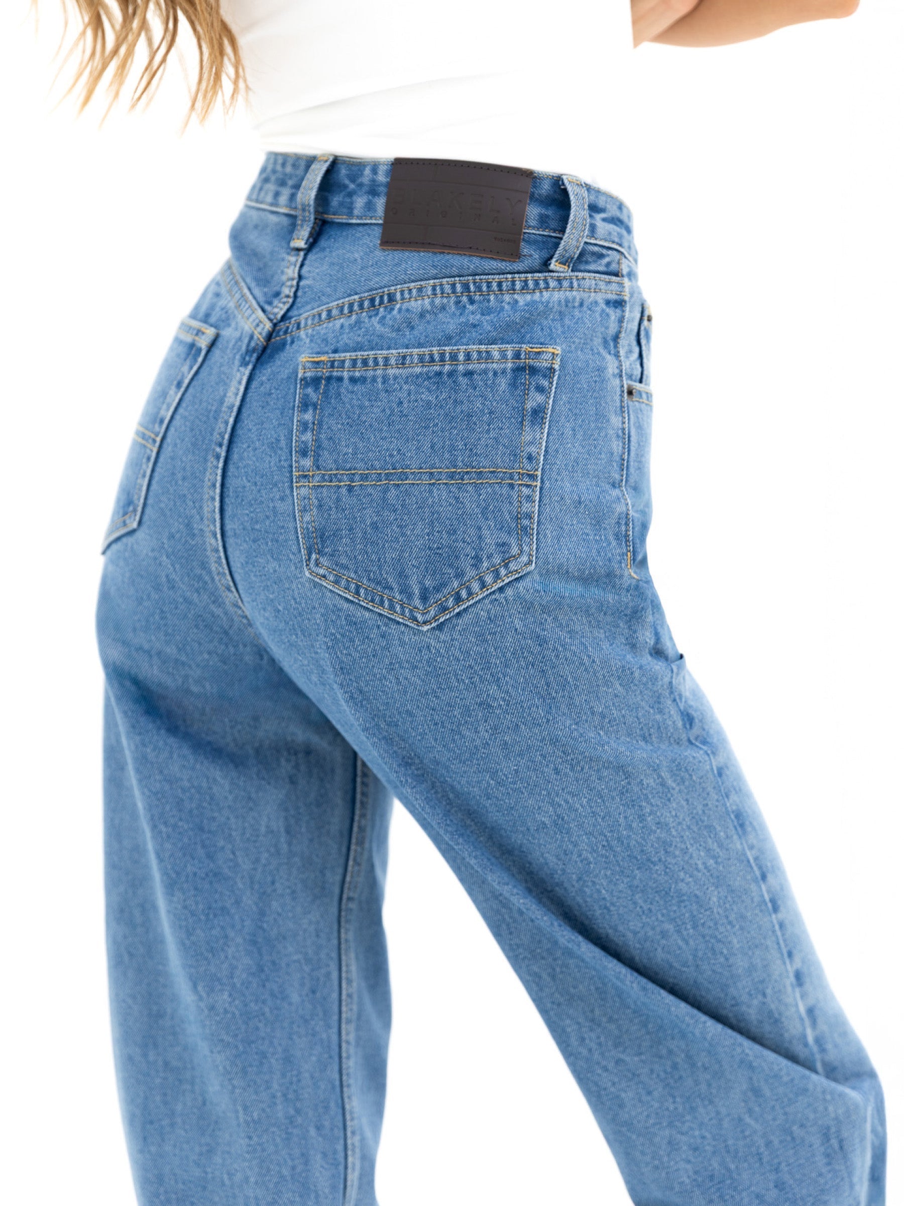 Our Blakely Mom Jeans have a High-rise, straight-leg, and relaxed through the hip. Made from durable, rigid denim that keeps its shape, wear after wear. Easy to style with everything from oversized knits to your favourite tee, they’re the ultimate throw-on-and-go denim for every day.